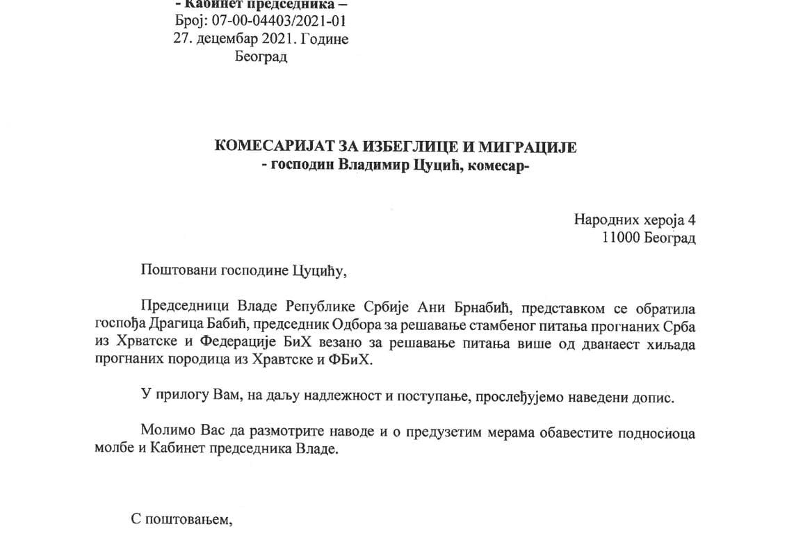 17. фебруар 2023. Молба Предсједнику Вучићу да се ријеши стамбено питање 12.000 прогнаничких породица